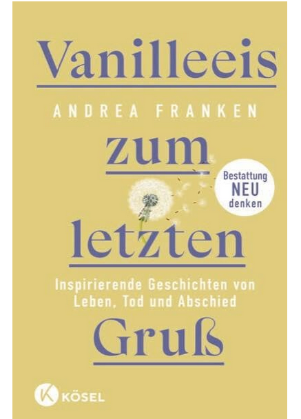 Und so freue ich mich riesig, dass es endlich dieses Buch von Trauerrednerin Andrea Franken gibt: Vanilleeis zum letzten Gruß. Inspirierende Geschichten von Leben, Tod und Abschied.
